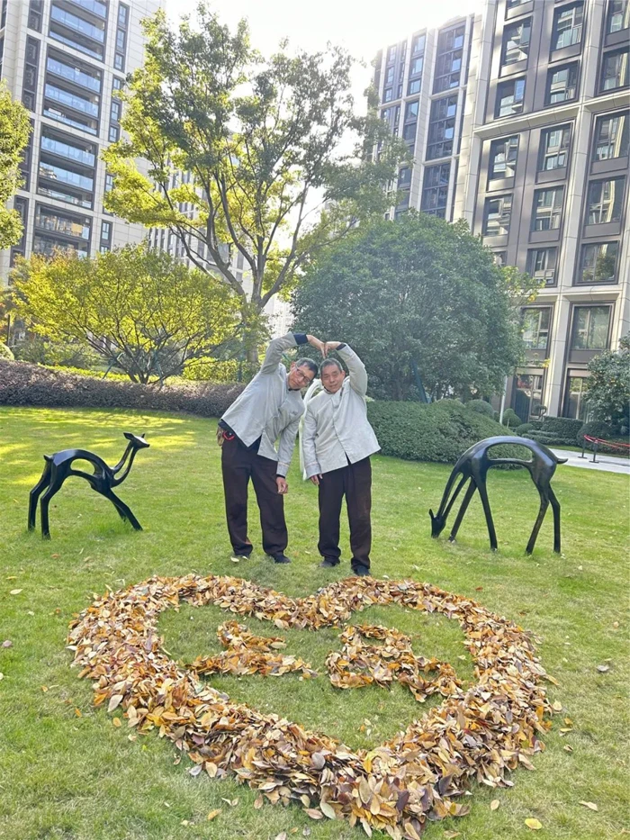 当小区里的落叶集聚愈来愈多时,激发了一线滨江物业人的创作动力,近期,杭州上品华庭小区的多名物业管家就在保洁人员的配合下,在草坪上创作了一系列的落叶作品:花开上品、笑脸常在、做一个有心人,小区两名保洁人员还在落叶作品前共同做了一个大大的爱心手势。