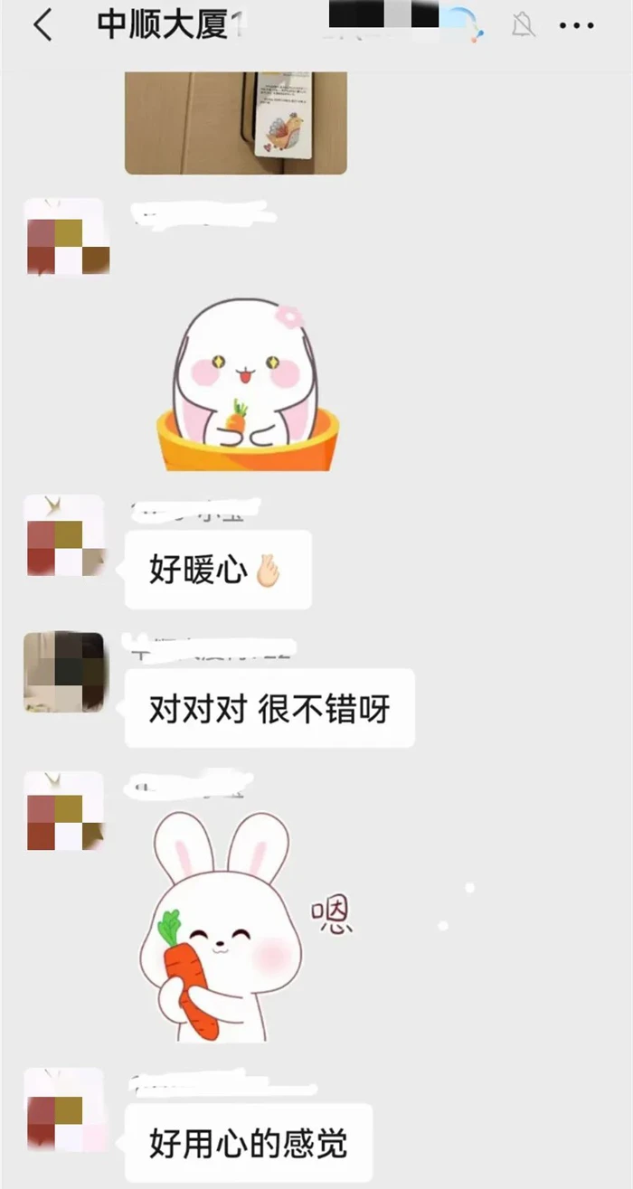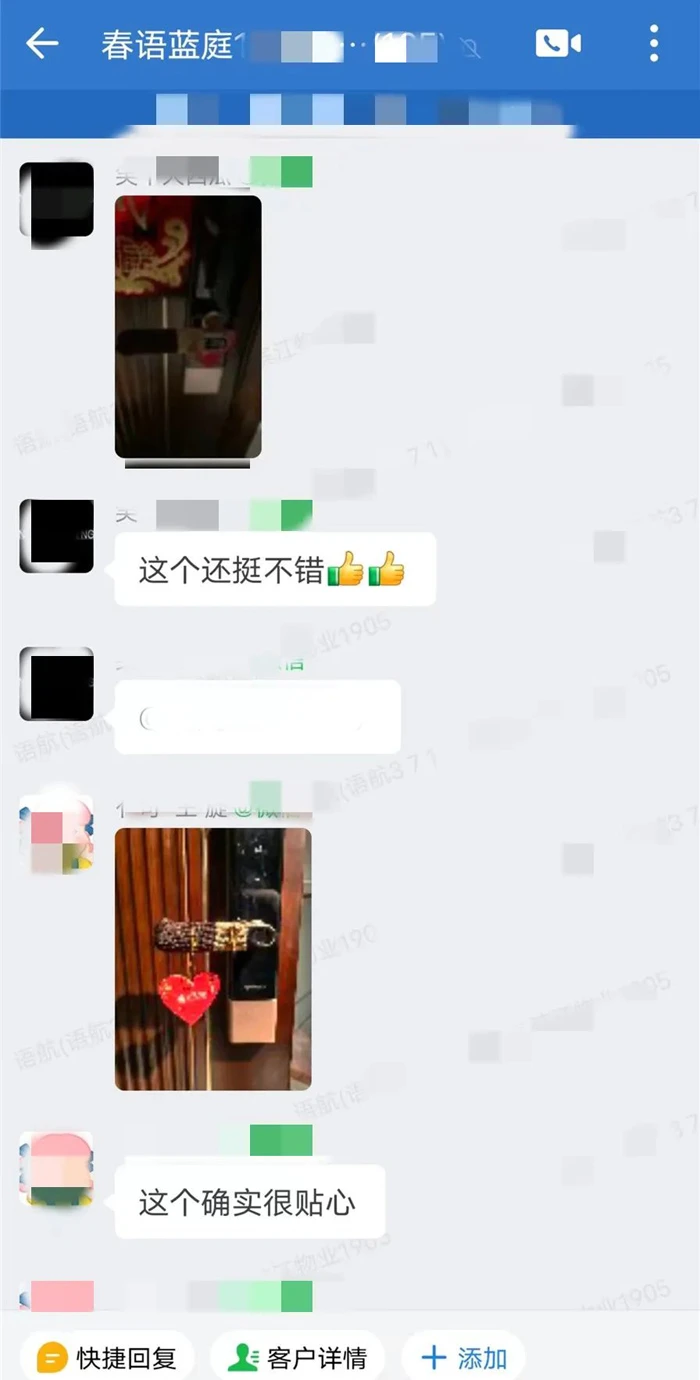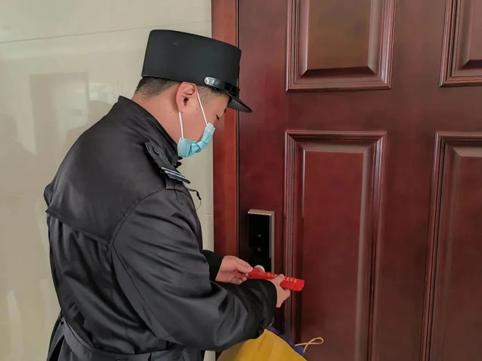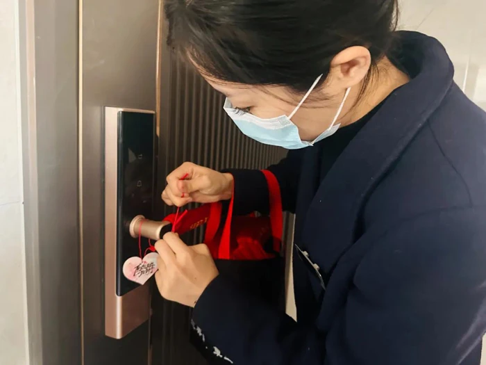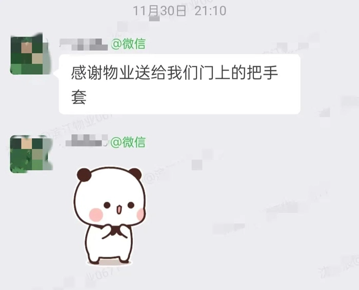 在物业人眼中,定制的金色字体“从心出发,让爱回家”,让他们倍感亲切,暖和实用的门把手套也得到了业主们的点赞。