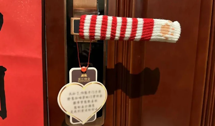 卡通猫猫的门把手套,今年杭州余杭区新里程项目用上了,管家贴心地给单身公寓的入户门把手穿上“毛衣”,新里程物业服务中心希望业主每次推门的那一刻再也不用担心冰手和静电,细致入微的服务也让业主感受到滨江物业人的暖心守护。