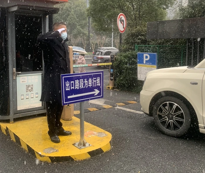 1月22日早上7:30,衢州春江月小区的雪开始慢慢大起来,物业服务中心在业主群提前发送防寒保暖等温馨提醒,一线滨江物业人忙着清扫园区内道路积雪、清除树木上的积雪,他们还对小区路面车辆放置挡雪板,食堂一早安排煮姜茶,为业主和物业人御寒。
