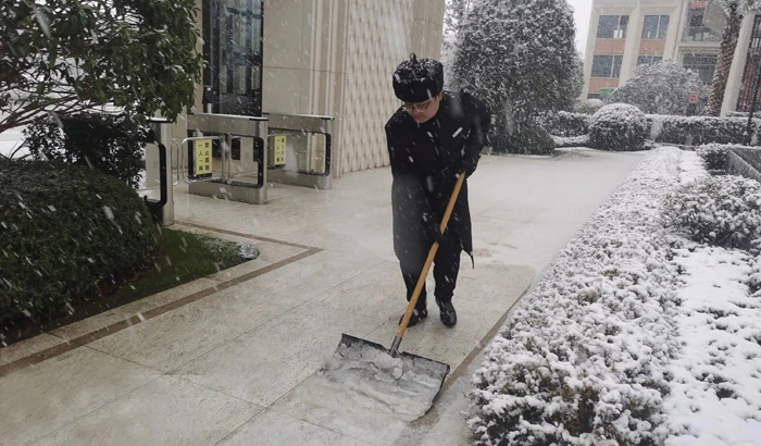 永康突降大雪,寒风刺骨,永康都市外滩园区道路铺上了一层积雪,管家上门为空置房业主、家中无人的业主家关闭室内门窗,队员与保洁奋力清扫小区路面积雪,保障业主出行安全。
