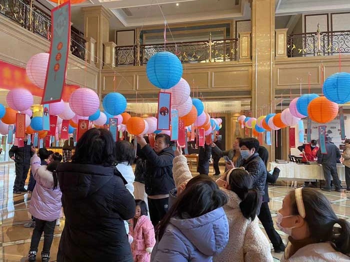 一条条精选谜语由滨江物业人和社区工作人员共同悬挂在一盏盏彩色灯笼下,吸引了上海斐勒公园业主们的目光,猜灯谜是元宵佳节的传统习俗,亲子参与,有趣而快乐,现场不时传来阵阵欢笑声。舞狮游园,将元宵活动推向高潮,居委会与业委会的两位老师共同为舞狮画龙点睛。本次活动有近三百名业主参加,不仅增进了邻里情,还在家门口体验到了闹元宵的传统文化。