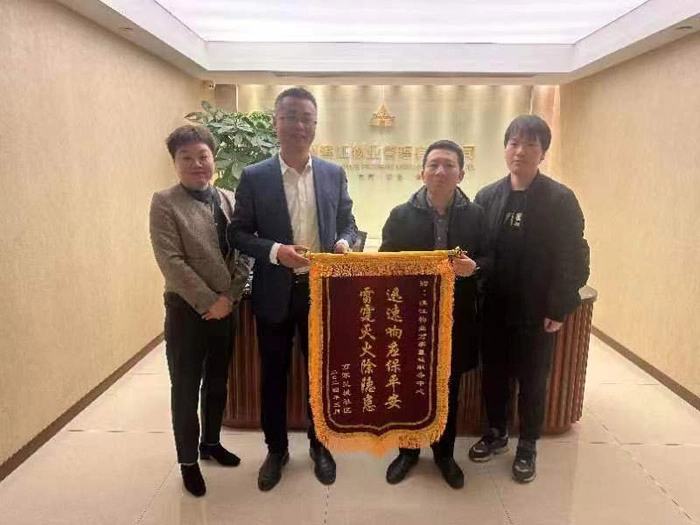 三月,杭州万家星城社区邵书记、谢站长来到滨江物业总部,向滨江物业执行总裁沈国荣赠送一面锦旗,锦旗上赫然写着“雷霆灭火除隐患,迅速响应保平安”,这是社区对万家星城小区一线滨江物业人在危急时刻迅速集合力量保障社区平安的高度认可与感谢。
