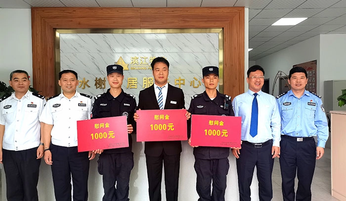 5月7日,杭州市公安局富阳区分局副局长邵智勇、富阳区见义勇为基金会和辖区派出所相关同志一行前往水榭山居物业服务中心,上门慰问陆伟铭、刘金标、韩新俊三名同志,并送上慰问金。