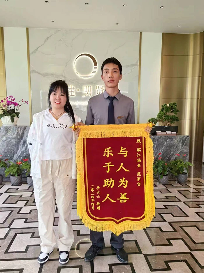 他询问李女士是否上医院,李女士表示家人就在附近,联系家人后她被送往医院。因摔伤致严重骨折,李女士休养了一个月,能完全走动后,她马上到售楼处送来一面锦旗,感谢范家宾“与人为善,乐于助人”。