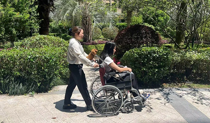 管家小春得知后,她与秩序晚班队员主动担负起业主上下班的接送。从5月6日开始,江女士有出行之需,小春都会第一时间从服务中心把轮椅推到她家门口,小心搀扶江女士坐上轮椅,将她送到大门口打车点,安全扶业主上车,晚班队员负责在小区大门口接送她回家。