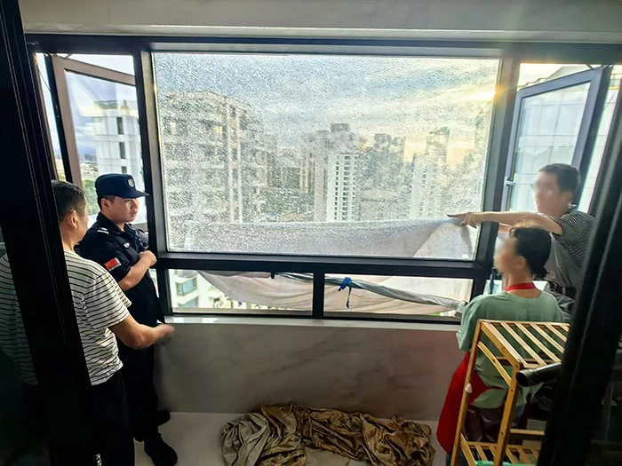 8月21日中午,雅悦府业主潘先生家中的阳台夹胶玻璃突然爆裂,业主第一时间请了一位玻璃师傅前来查看,但是18楼的高度,拆除玻璃时如何防止坠落成了一大难题。