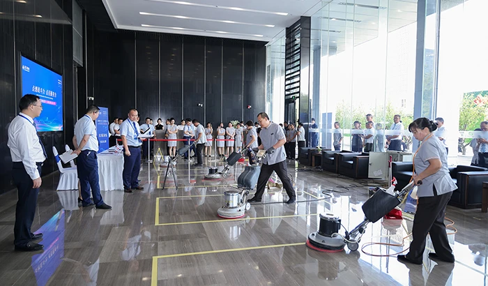 园区整洁、清亮的环境有赖于保洁人员的辛苦付出。保洁人员在比赛中用专业的技术和流程完成玻璃擦拭和大理石抛光,他们操作规范、动作熟练、清洁均匀,呈现光亮的考核标准。在物业团队中,每一个岗位皆不可或缺,皆有其精湛的技艺和服务标准,保洁人员用自己的专业服务赢得大赛评委的肯定。