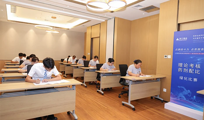 园林绿化美不美,与绿化人的精心养护分不开。走进赛场,还得看绿化人的专业知识和实操技能是否扎实,他们从绿化专业知识测试到药剂配比演练,认真发挥,精准配比,为提升滨江物业园林绿化这张金名片而不懈努力。