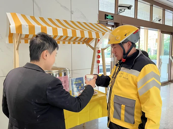 这几天,送货的快递小哥在杭州万家花城一期小区惊喜发现为他们准备的加油小驿站,小哥手捧一杯热腾腾的桂花红茶说:“夏有凉茶,冬有桂花红茶,这个小区服务真好。”