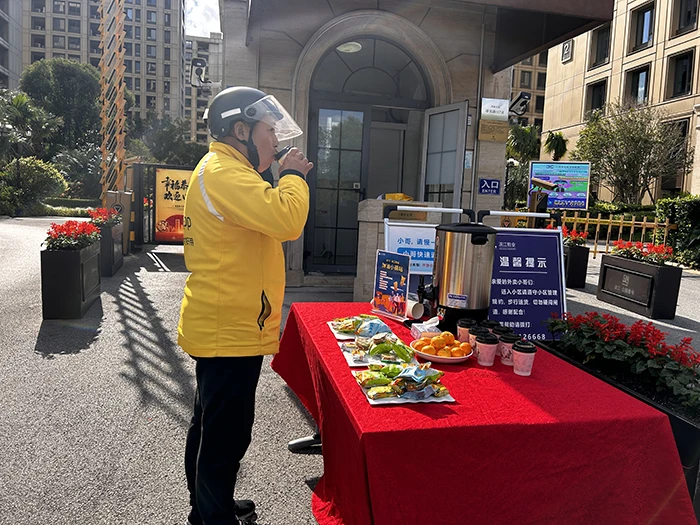 在杭州澜颂奥府小区的加油小驿站,快递小哥接过物业人递上的一杯桂花红茶,他表示受宠若惊,工作这么辛苦,还没有哪个小区,对他们这么热情,今天是个特别的日子,能喝上一口热茶,心里都是满满的幸福感。这个加油小驿站,物业人摆放了两款热饮桂花红茶、柠檬茶,还有小点心可供小哥们选择补充能量。物业人员说,为小哥们加油,也是为业主的包裹护航。