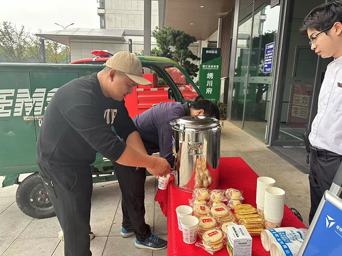“物业还有这个服务?”“杭州的秋天,能喝上一杯桂花热茶,真的太幸福了。”每一个喝上热饮的小哥们都相当开心。