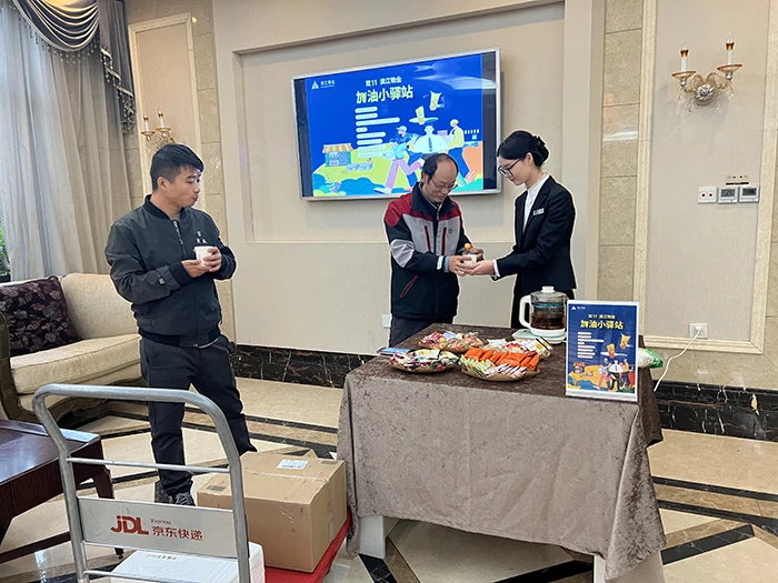 杭州云荷廷、义乌绣川府、衢州春江月、乐清金色家园等小区的加油小驿站,也向辛勤付出的快递小哥,外卖小哥们送上了温暖和关爱。在义乌绣川府的小驿站,有桂花红茶、旺旺雪饼,还提供创可贴等贴心服务,“被人惦记的感觉真好。”小哥们发出的真实声音,也让一线滨江物业人做好创新服务充满动力。