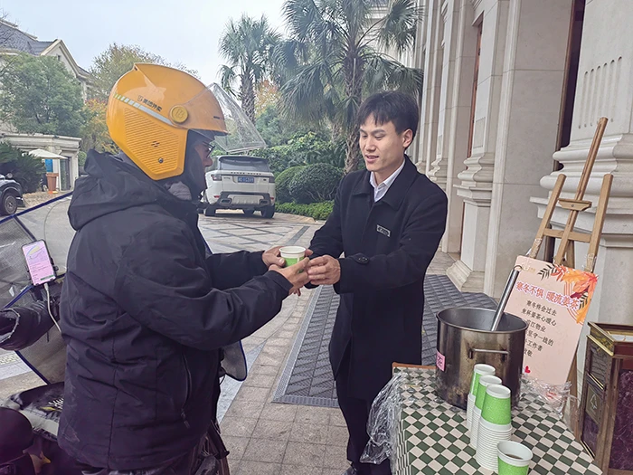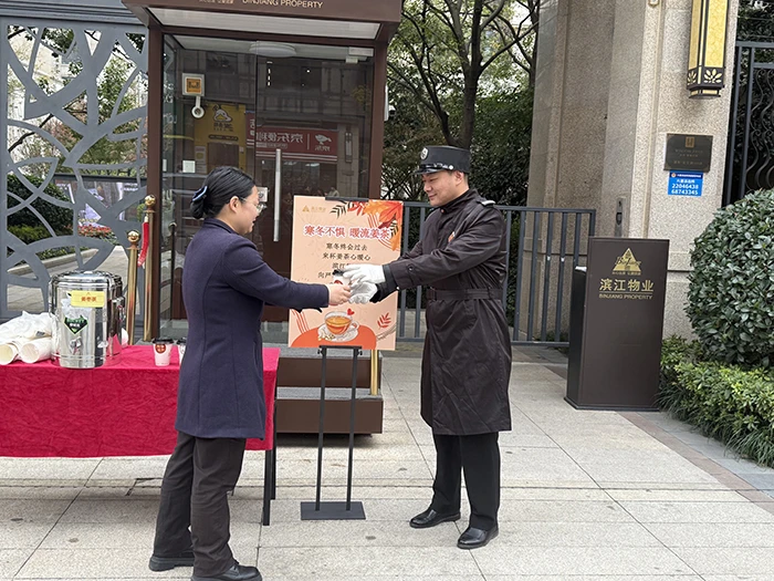初冬清晨,温岭万家之星小区南门口设置了姜枣茶派发点,物业人员将自己熬煮的一杯杯热乎乎、驱寒的姜枣茶送到了业主、环卫工人手中。物业人递出姜枣茶时不断关照业主、小哥们路上要注意安全,向环卫工人表达“您辛苦了”,这些都映照出一线滨江物业人服务的温度和对服务理念的坚守。