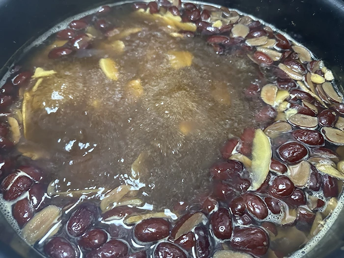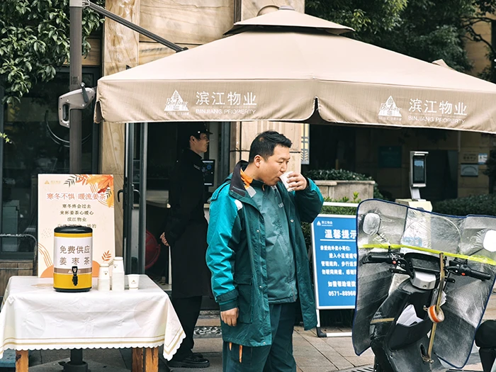 在杭州湘湖壹号小区,物业人员用一勺勺红糖、一片片生姜、一颗颗红枣熬出了热气腾腾的姜枣茶,供寒冬坚守在一线的外卖、快递小哥和一线物业人,以及园区业主取饮。物业人员表示,我们将红枣去核后剪成一片片与姜片、红糖一起熬煮。一大早,工作人员熬煮2个小时后,一大锅热气腾腾的姜枣茶放置在了会所门口桌台上,很快就把驱寒姜枣茶送到了大家的手中。