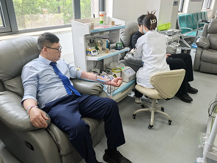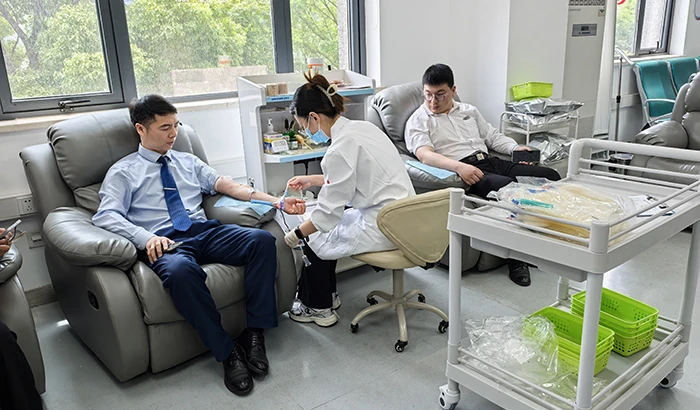 第二天,第一批员工到达浙江省血液中心滨江院区献血1100ml, 他们是物业主任王小华、姜文正,主任助理冯瑜,金涛同志。