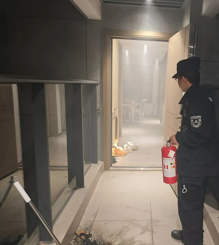 住户打开房门,屋内浓烟弥漫,物业人员发现屋内有纸板在燃烧,他们立即用灭火器灭火,并在住户家用水盆接水的方法一同将火扑灭。随后,他们把现场剩余的纸板和杂物拖到外面连廊处置,直到完全熄灭。