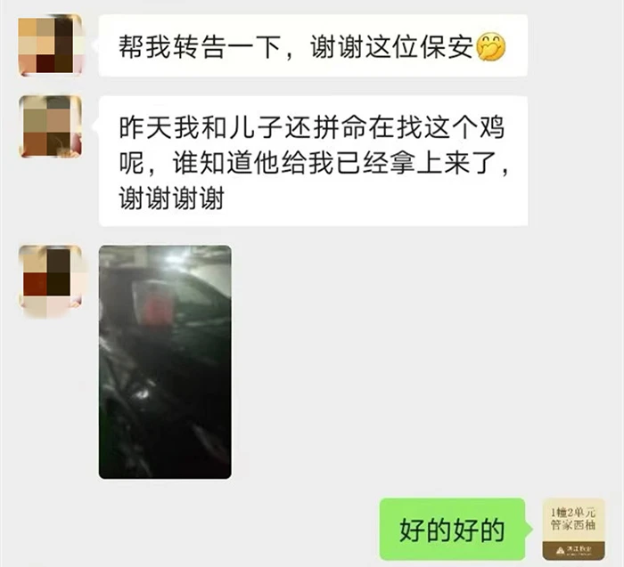 次日一早,业主专程让管家找到昨晚巡逻的保安帮忙转达谢意。从发现异常到妥善保管和送达,这场“冰冻鸡保卫战”仅用了30分钟。