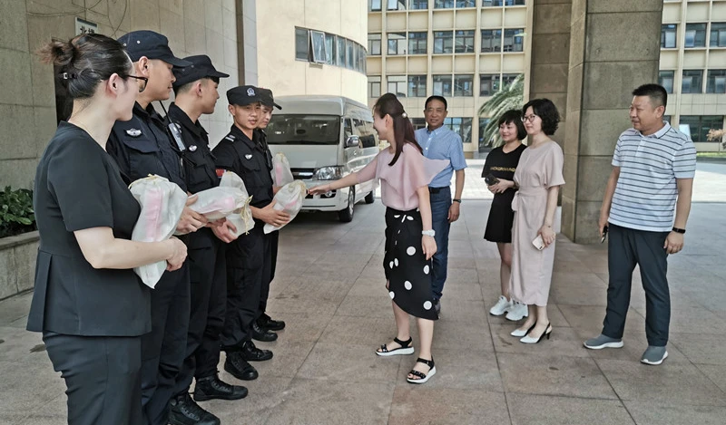 7月26日,江干区机关事务管理中心一行领导冒着暑热当头下,看望慰问江干区政府大楼物业服务中心的一线员工,并亲自为一线员工发放清凉饮品以及防暑药品等。