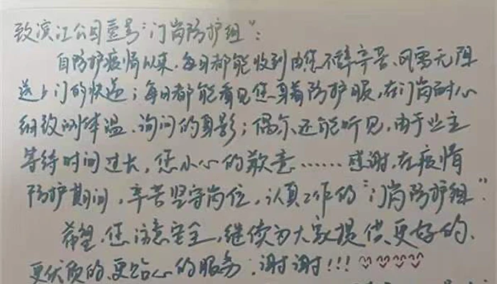 日前,上海公园壹号五户业主亲笔写来联名表扬信,表扬物业门岗队员,并给他们取了一个“门岗防护组”的称呼。信中写道:自防护疫情以来,每天都能收到由您不辞辛苦、风雨无阻送上门的快递;每日都能看见您身着防护服,在门岗耐心细致测体温、询问的身影;偶尔还能听见,由于业主等待时间过长,您小心的歉意……感谢,在疫情防护期间,辛苦坚守岗位,认真工作的“门岗防护组”。希望您注意安全,继续为大家提供更好的、更优质的、更贴心的服务,谢谢!(附加上四个可爱的笑脸)