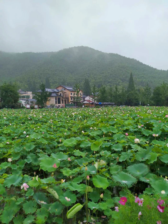 汽车在村口停下,移步即景,满眼青翠,池塘里荷花盛开,夏日余村更显江南农村的美丽。大家一路欣赏着大自然美好的风光,顺着宽阔平整的入村大道,远远就看到一块黄褐色的巨石,上面刻着“绿水青山就是金山银山”的大石头巍峨矗立村口,这里就是闻名全国的“两山”会址公园。