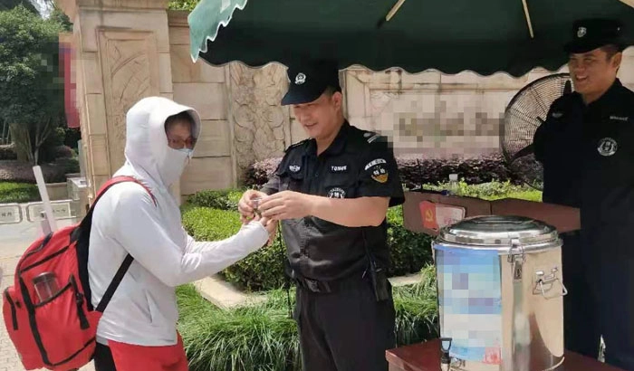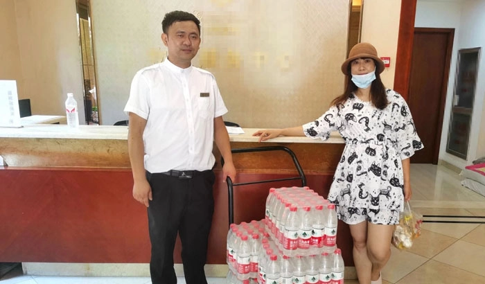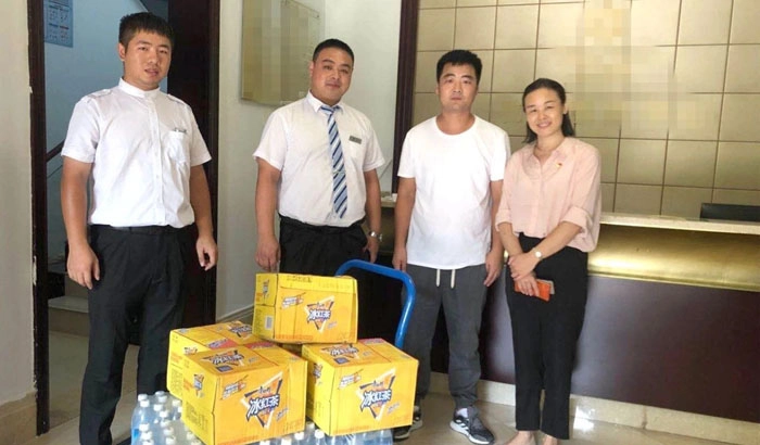 8月1日中午,金色黎明二期一位女业主路过岗亭,看到一线队员在高温下坚守工作,她感到一线物业人员的辛苦与不易,转身去商铺便利店购买了五箱农夫山泉送给一线队员表示慰问。