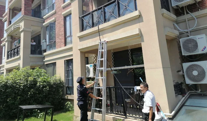 在这千钧一发之际,物业华主任急中生智,考虑到火情位置位于二楼,架梯上楼灭火是一个可行的思路,借用一楼业主家花园里的水管与三楼业主家的水源从上下围攻灭火,将在时间上赢得先机,他一边让秩序主管高磊迅速取来绿化长水管,一边安排搭梯子爬梯上楼救火。