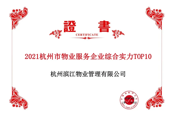 杭州滨江物业管理有限公司荣膺“2021中国物业服务百强企业”殊荣,排名第17位,较2020年名次前进9个位次,荣获“2021杭州市物业服务企业综合实力第2位”,其在管项目滨江江南之星、滨江西溪之星荣获“2021中国五星级物业服务项目”称号。