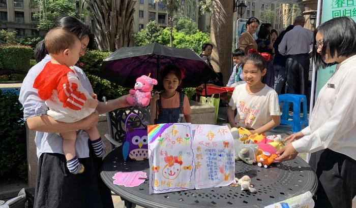 在云荷廷的跳蚤街现场,让业主们惊喜地看到许多不一样的产品,学习书籍、自编书刊、文具、软糖、手工蛋糕,还有小朋友自己制作的节能产品太阳能电风扇、太阳能机器人。要想有好生意,少不了摊主主动出击、兑换小礼物、套圈玩法,现场小老板们的吆喝声“瞧一瞧,看一看,走过路过不要错过啦”,也十分有感染力,能吸引到买家光顾自己的摊位。