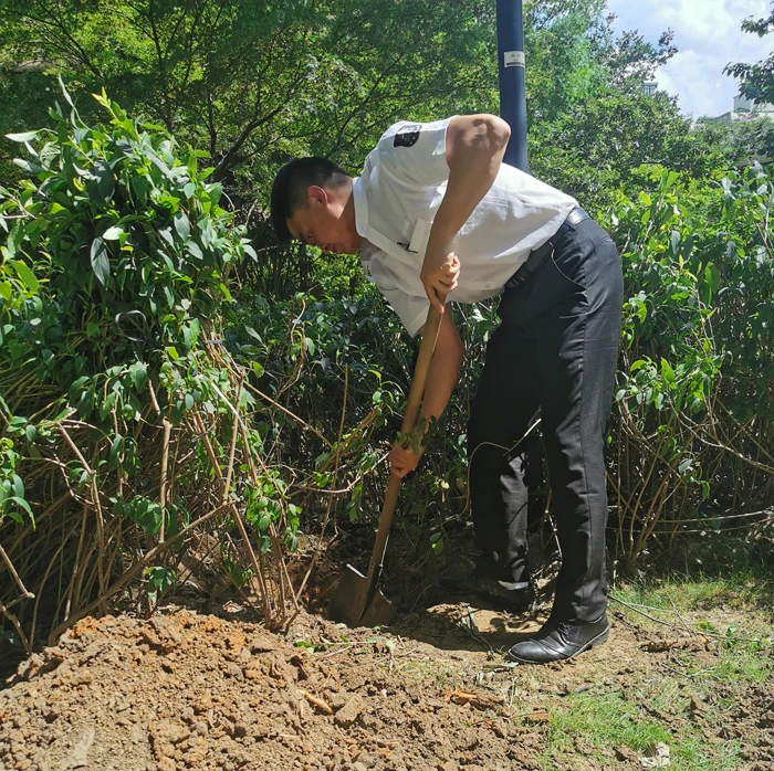秩序主管眼看园林人在大热天如此辛苦地工作,深感不易,也主动加入到他们补种树木的队列中。