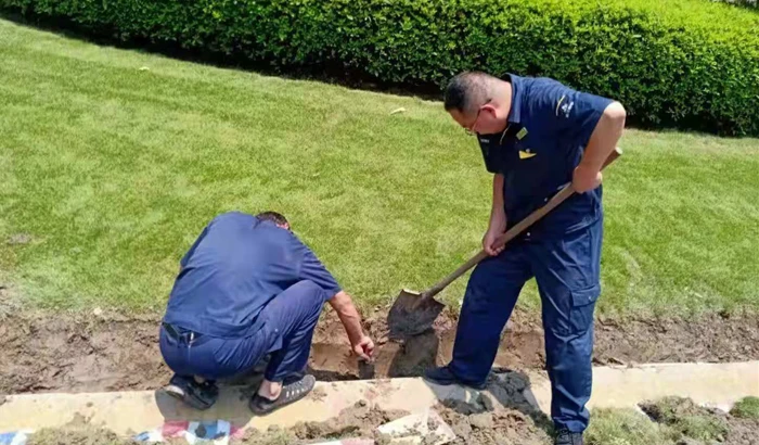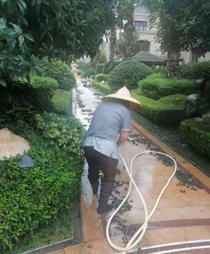 服务在于细节,高温也不例外,他们清洗每一块鹅卵石,早已汗流浃背,他们是业主心中的园区美容师。