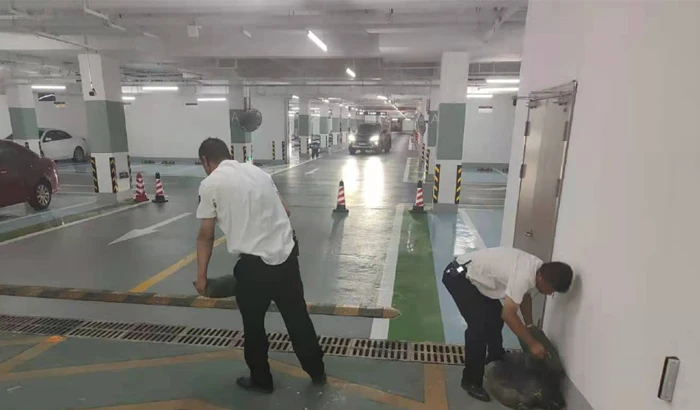 园区重点项目检查要求认真到位,周密细致。一线物业人检查并清理天沟地漏、地下车库的排水系统,保证排水通畅;检查各楼层安全通道窗户关闭状态,防止风雨侵入;整理、加大填补各汽车坡道口防汛沙袋,严阵以待;加强检查设施设备,确保正常运行;加固园区树木,防止被强台风刮倒;巡查空置房,关好门窗,检查阳台地漏;做好小区防汛抗台的宣传工作,提高业主防台安全意识。