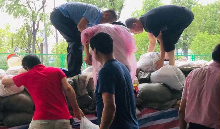 这样的场景物业人从来没有见过,园区女业主负责装沙包、扎沙包,男业主扛沙包出力气,物业人、房产人堆沙包,大家奋战一线,众志成城。暖心业主为大家送来了牛奶、肉包与盒饭。