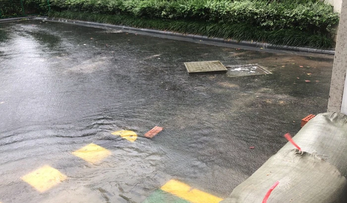 9点,河水开始倒灌小区,马上与室外集水井水位平行,洪水如猛兽,服务中心立即启动应急预案。