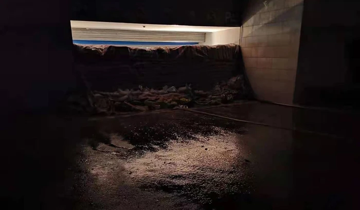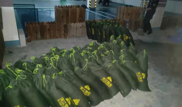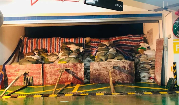 下午3:15,水位达到1米2的历史高位,沙包的高度已堆到1米6, 大家严防死守,硬是把水挡在了地库外。