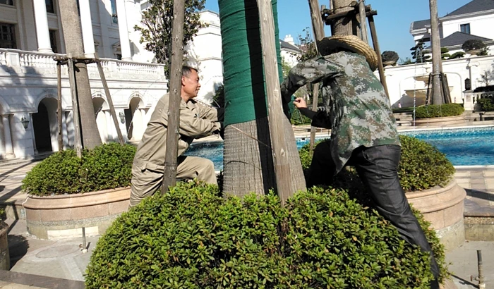 滨江楼盘的一大特色是热带植物风情,棕榈树、加拿利海枣、华盛顿棕等热带植物都有它们的倩影。这几天在绿化人的辛苦努力下,他们按照标准在树木根部向上2.5—3米处给热带植物穿上了保暖的无纺布外套,以提高树木的御寒能力。如果气温低于零下,滨江物业园林守艺人郭老师建议大家给这些树木再穿一件塑料薄膜的加强服。