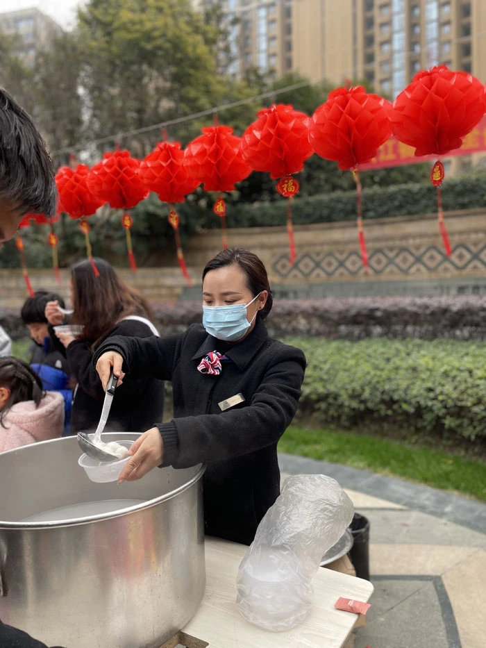 在杭州城市之星,为贯穿防控措施,一个元宵活动分为上午与下午两个时间节点,上午园区现传统舞龙,下午在会所两个独立空间展开猜灯谜、品汤圆、DIY灯笼。戴好口罩、保持社交距离也是物业人要求业主遵守的基本规则。