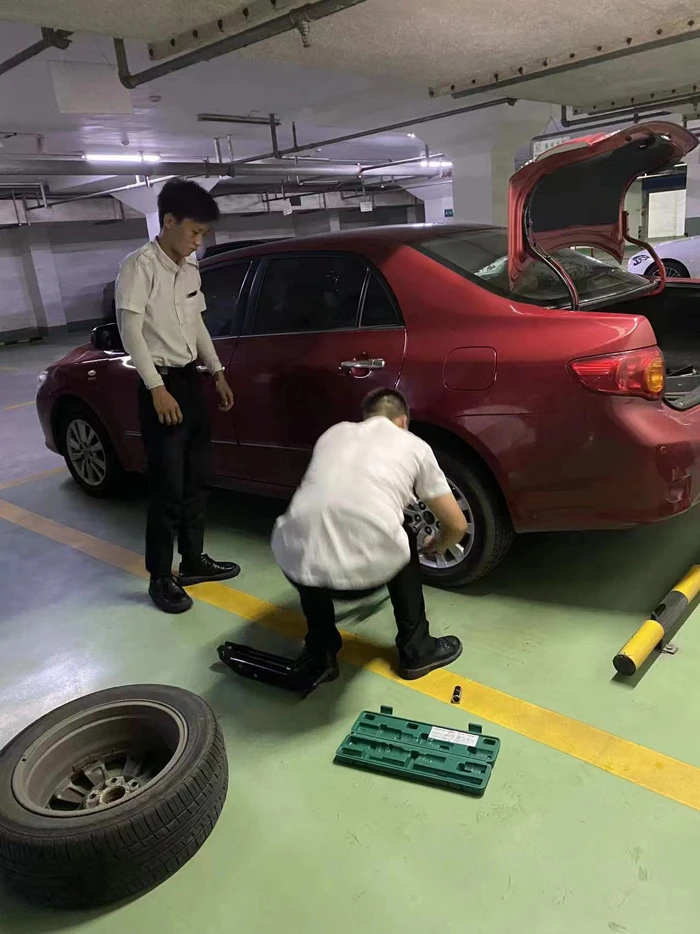 杭州万家花城一期业主陈女士,日前发现自家汽车左后轮胎完全漏气,家人都外出了,着急之中也是想到了物业,服务中心立马安排两位有经验的秩序队员杨薛龙、王文泽到现场处理,最终帮业主换好了备胎。这两位队员都是老司机,换个轮胎不是难事。陈女士不仅致电服务中心,还在业主群对滨江物业表示感谢,点赞物业服务到位。