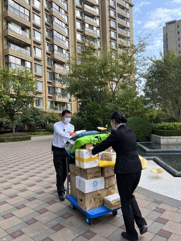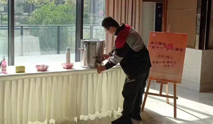 杭州江南之星物业经业委会同意,早早地为小哥们开辟了一个空间作为快递分拣大厅,在这个大厅一角设了爱心小驿站,有矿泉水、热水、茶饮,小哥累了随时饮用。项目主任王培飞说,11月1日开始,小区快递量就开始逐步增加,11月2日小区快递量达到三千件,是平时的1.5倍。当天,物业管家与队员都加入到了送货到家的服务行列,忙到晚上九点多,这个爱心小驿站,也成为了物业人喜欢随时去补充能量的地方。