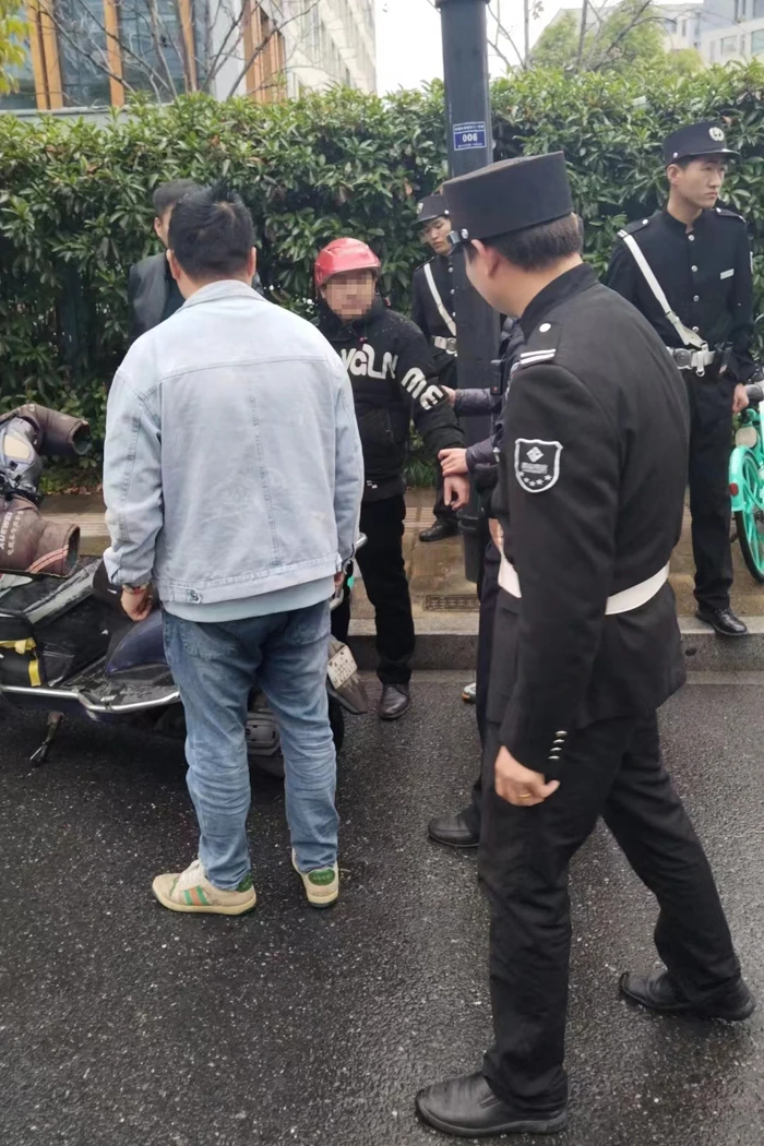 14:43分,东路面东门岗队员郑晓辉突然发现嫌犯骑电动车路过,他马上用对讲机汇报寻求支援,现场,他以配合调查为由拦下嫌犯并稳住他,与急速赶到现场的刘浩宇共同将嫌犯拦截,防止其逃跑。